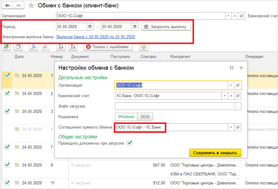 Если за счетом организации в настройке обмена закреплено соглашение прямого обмена с банком, то при загрузке выписки будет открыта форма электронного обмена, а так же прочитана последняя полученная выписка. Для получения новой выписки нужно указать период и нажать кнопку Запросить выписку.