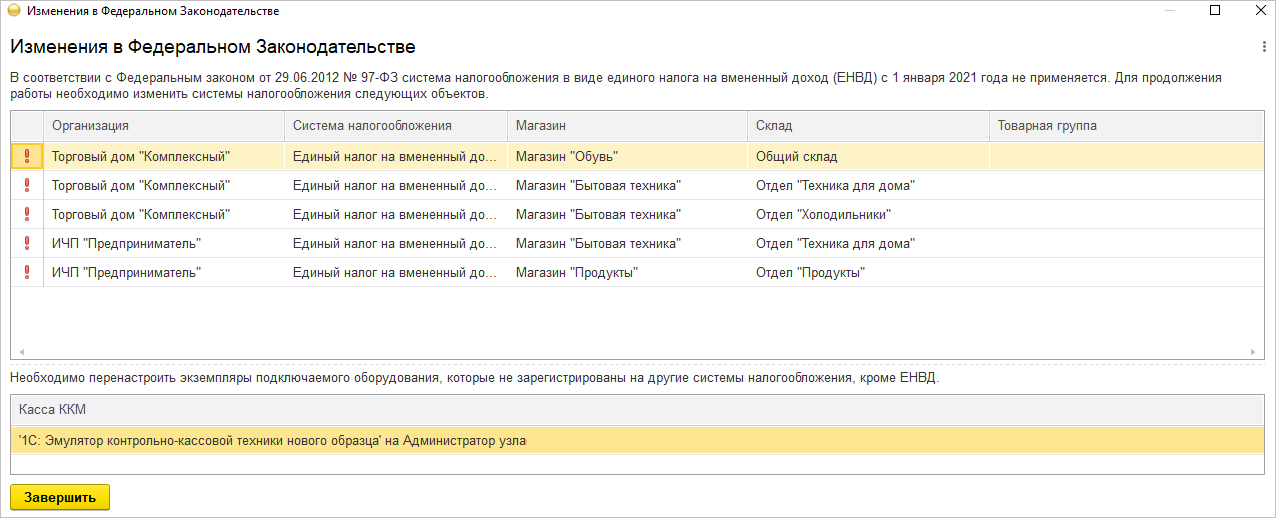 Для удобства пользователей при запуске новой версии «1С:Розницы» автоматически будет выполнена проверка на использование в программе ЕНВД. Если такая СНО применяется, то будет открыто окно Изменения в Федеральном Законодательстве со списком объектов, которые необходимо изменить.