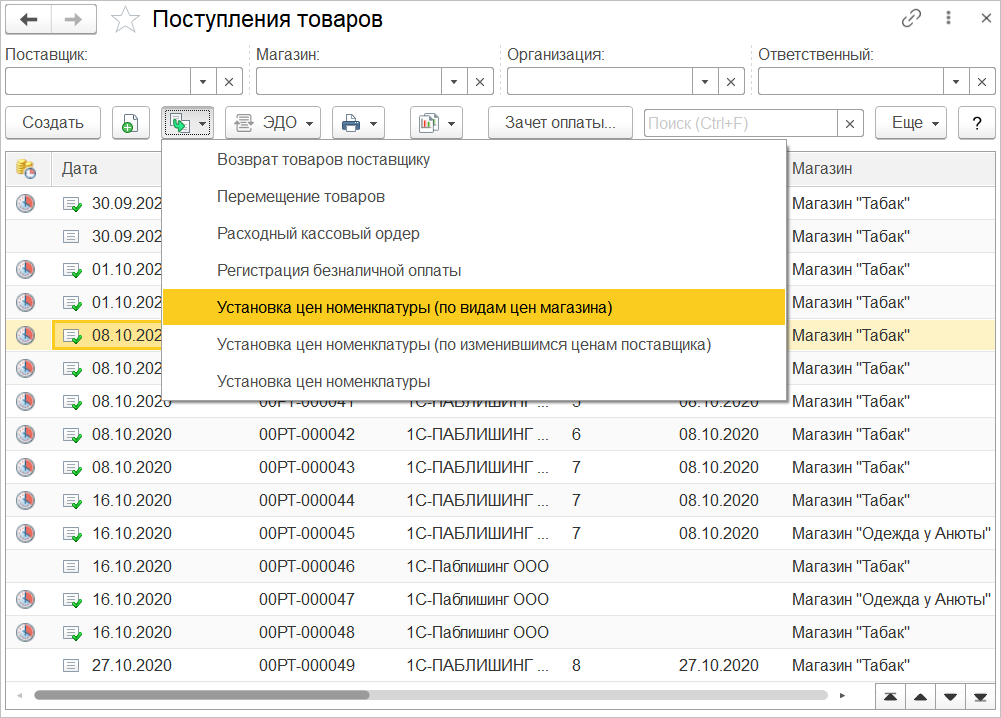 При создании документа Установка цен номенклатуры на основании Поступления товаров у пользователей появилась возможность установить цены по видам цен магазина, указанным в его правиле ценообразования.