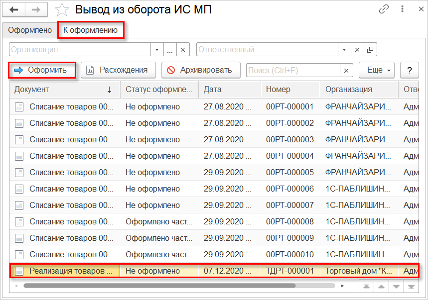 После обмена с ИС МП статус документа примет значение Коды маркировки выведены из оборота.