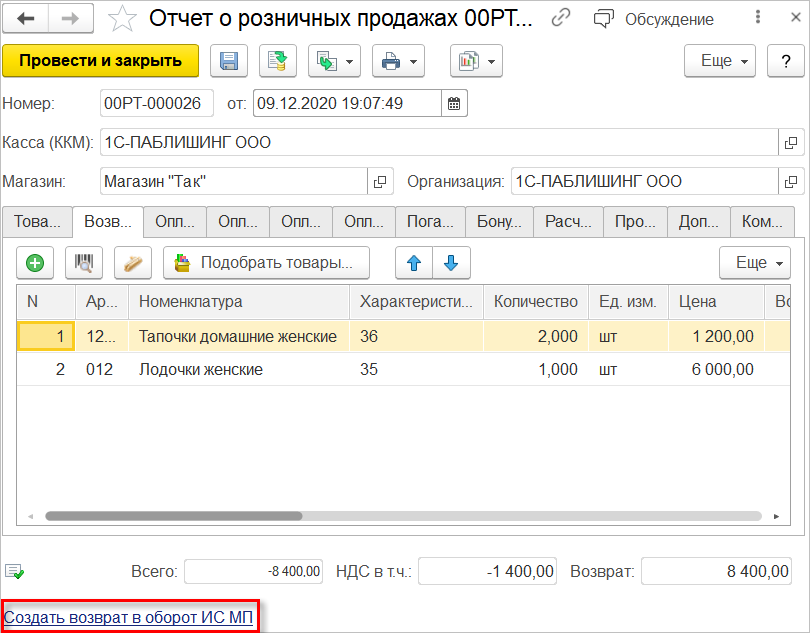 Если Отчет о розничных продажах был создан с помощью обработки закрытия смены, и в чеке на возврат была считана марка возвращаемой продукции, то при формировании документа Возврат в оборот ИС МП марка заполнится автоматически.