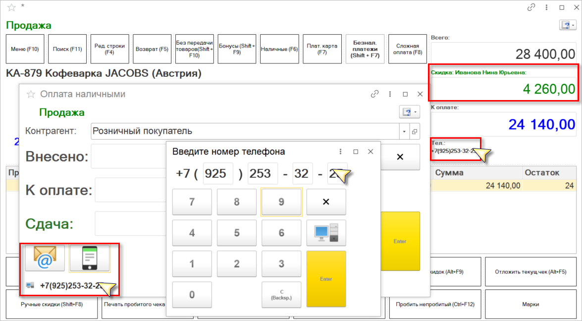 В новой версии программы был добавлен подбор дисконтной карты по QR-коду. Теперь, считав QR-код при оформлении продажи, можно подобрать телефон, адрес электронной почты клиента для отправки ему электронного чека. Если контактные данные дисконтной карты в базе окажутся неактуальными – не выходя из формы можно внести и сохранить новые.