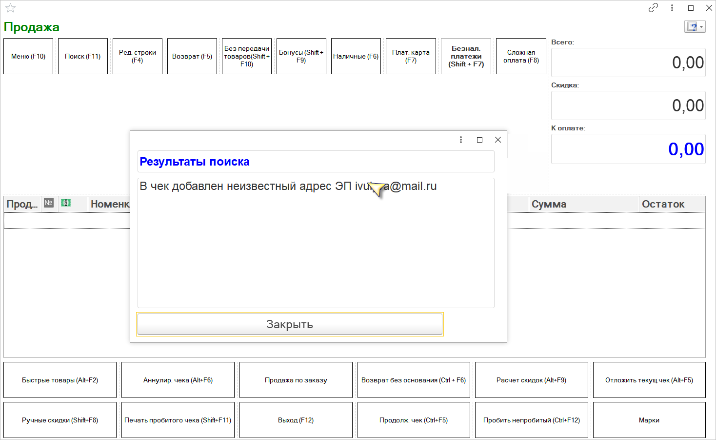 Если же дисконтная карта покупателя не найдена - на форму РМК и в Чек будет добавлен считанный контакт, на который можно будет отправить ему электронный чек.