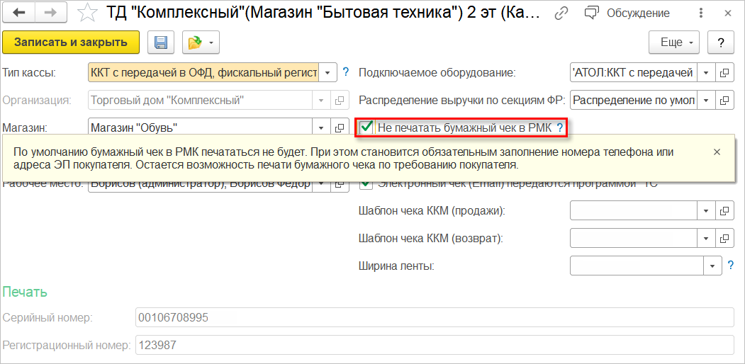 Для обеспечения данного функционала в карточку кассы ККМ был добавлен признак Не печатать бумажный чек в РМК. После установки этого флажка обязательным становится заполнение контакта покупателя для отправки ему электронного чека при оформлении продажи.