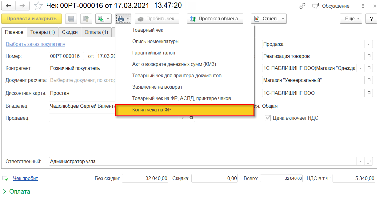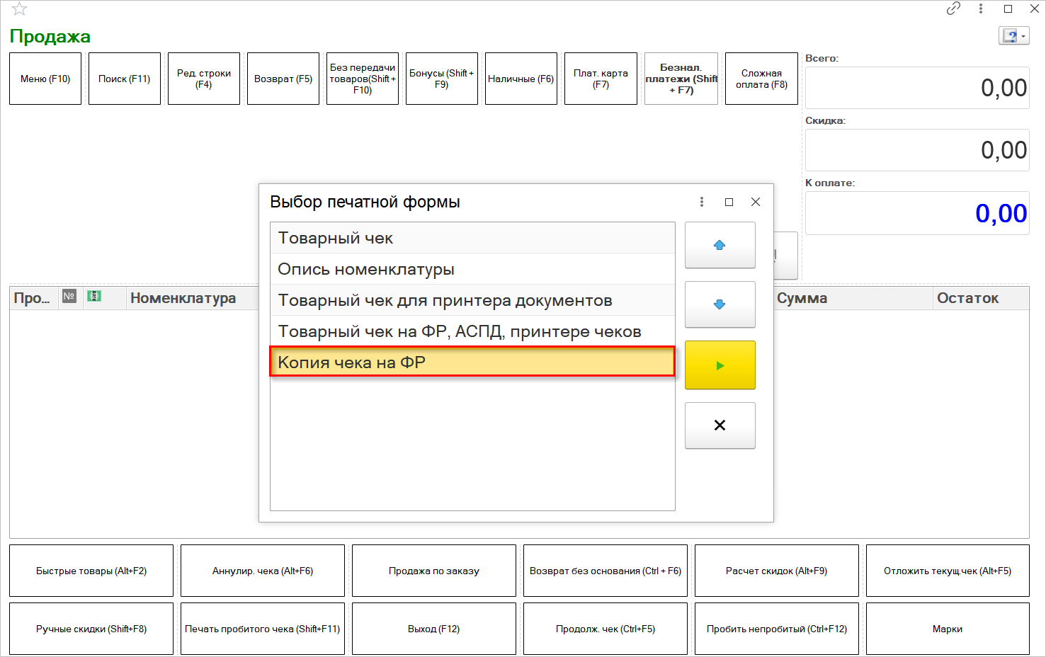 Для пробития бумажной копии чека без фискализации (уже после оформления продажи) в список форм команды Печать пробитого чека была добавлена форма Копия чека на ФР.
