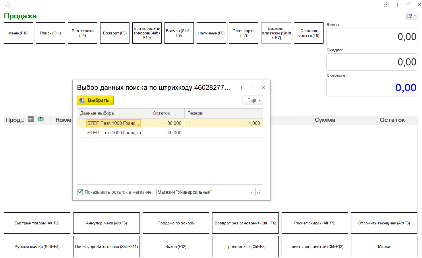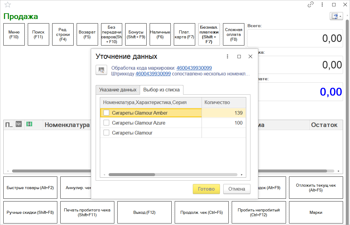 Дополнительно были исправлены ошибки уточнения данных, которые могли возникнуть, при наличии в базе дублирующихся штрихкодов, а также изменен сам механизм обработки штрихкодов. Например, если считана не марка и данный штрихкод не привязан ни к одной маркируемой позиции, то обработка осуществляется средствами «1С:Розницы», без ГОСИС.