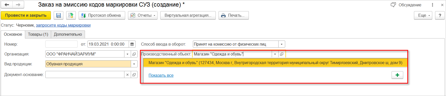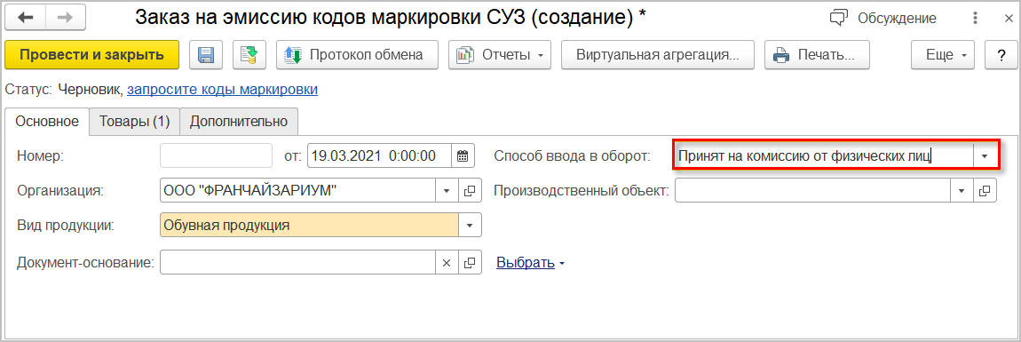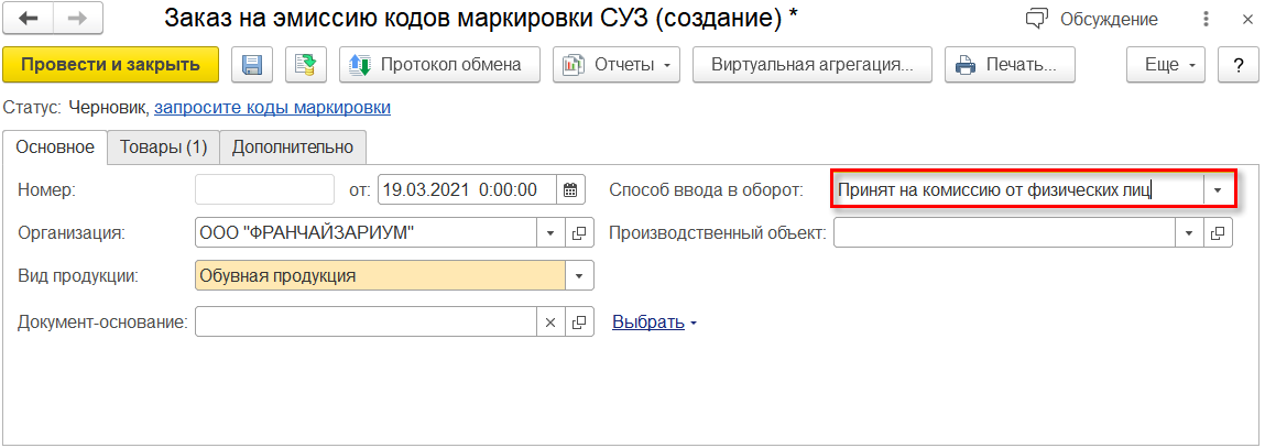 При приеме на комиссию товаров, подлежащих маркировке, от физического лица организация-комиссионер должна выполнить маркировку этих товаров. В программе заказ кодов маркировки можно оформить документом Заказ на эмиссию кодов маркировки.