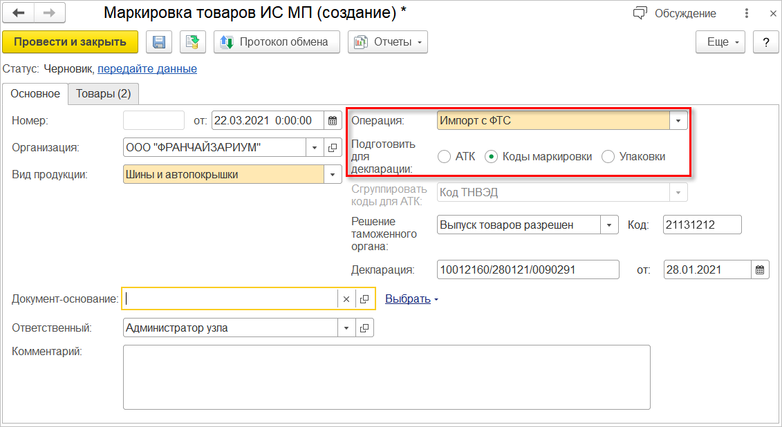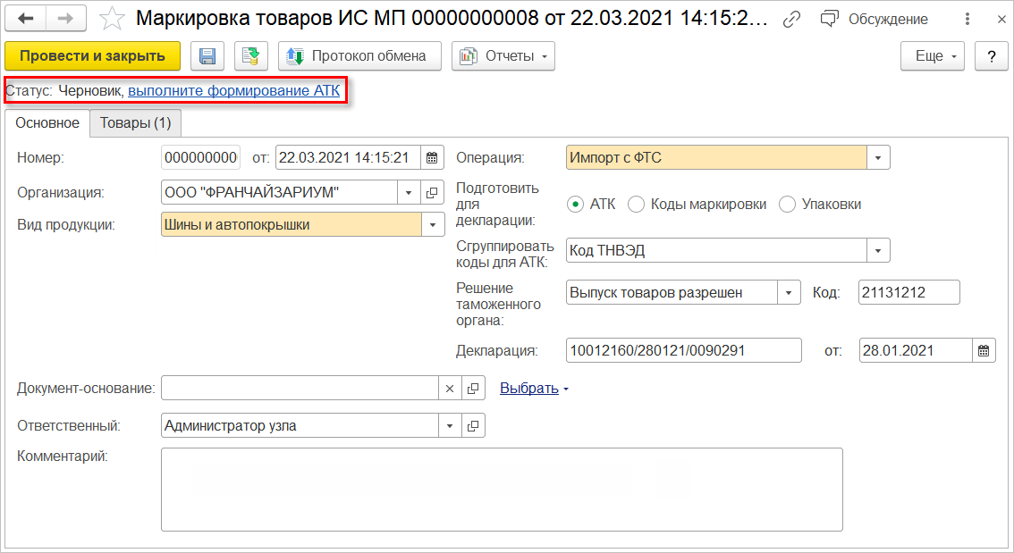 Коды АТК, как правило, применяется, если список импортируемых кодов маркировки превышает допустимое количество кодов в декларации. Для формирования этих кодов на форме документа предусмотрена ссылка выполните формирование АТК.