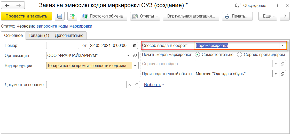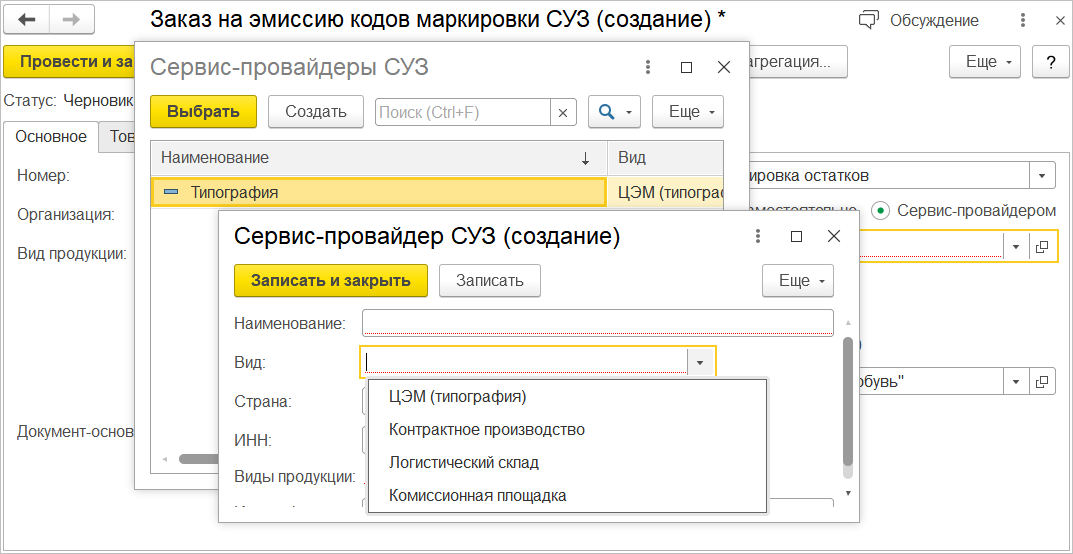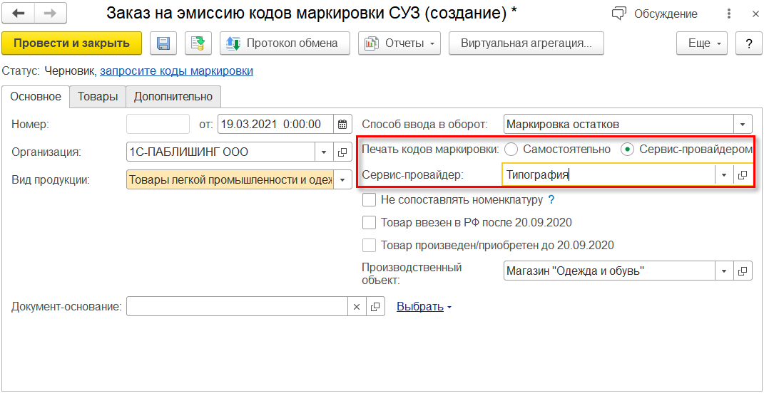 Для использования второго варианта в документ Заказ на эмиссию кодов маркировки СУЗ для поля Печать кодов маркировки был добавлен вариант Сервис-провайдером.