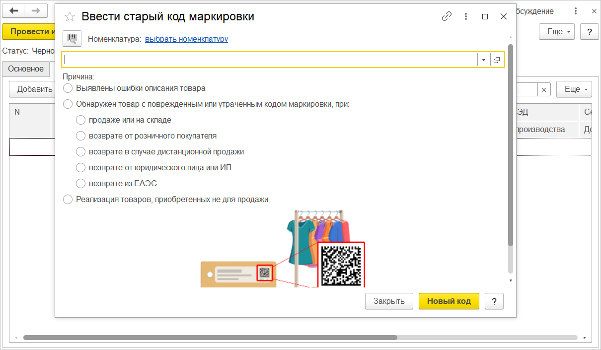 В программе доступна функция ввода в оборот новых кодов маркировки для товаров в случае утраты, повреждения старого кода маркировки или невозможности дальнейшего оборота со старым кодом по другой причине. Оформить данную операцию можно с помощью документа Перемаркировка товаров ИС МП, в которой доступен подробный список причин для перемаркировки товаров.