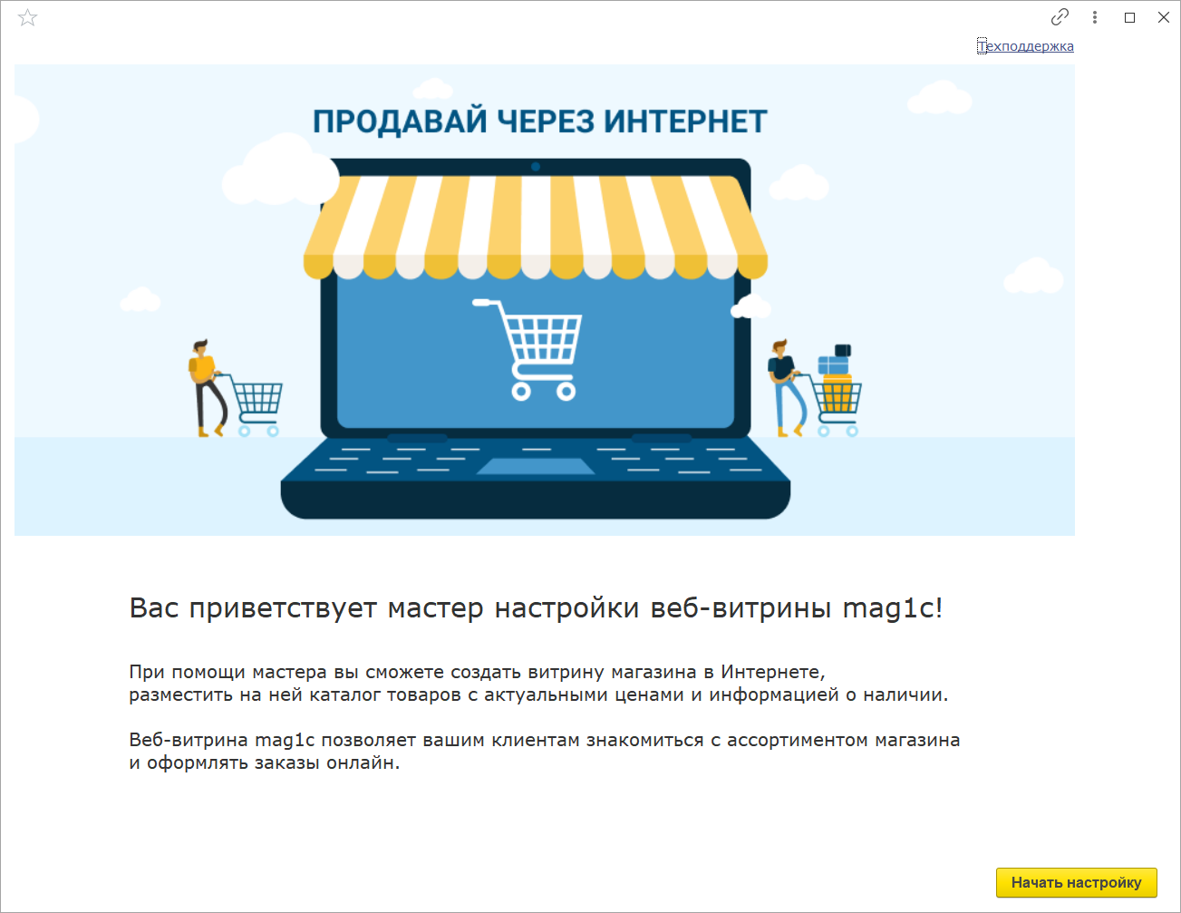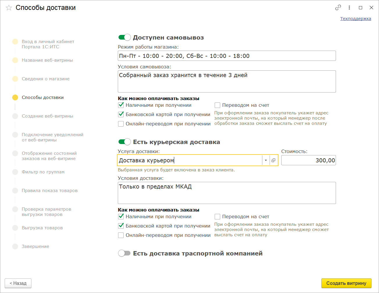 С помощью удобного мастера настройки даже неопытному пользователю будет легко создать веб-витрину, наполнить ее товарами и ценами из программы, указав дополнительно условия доставки и оплаты.