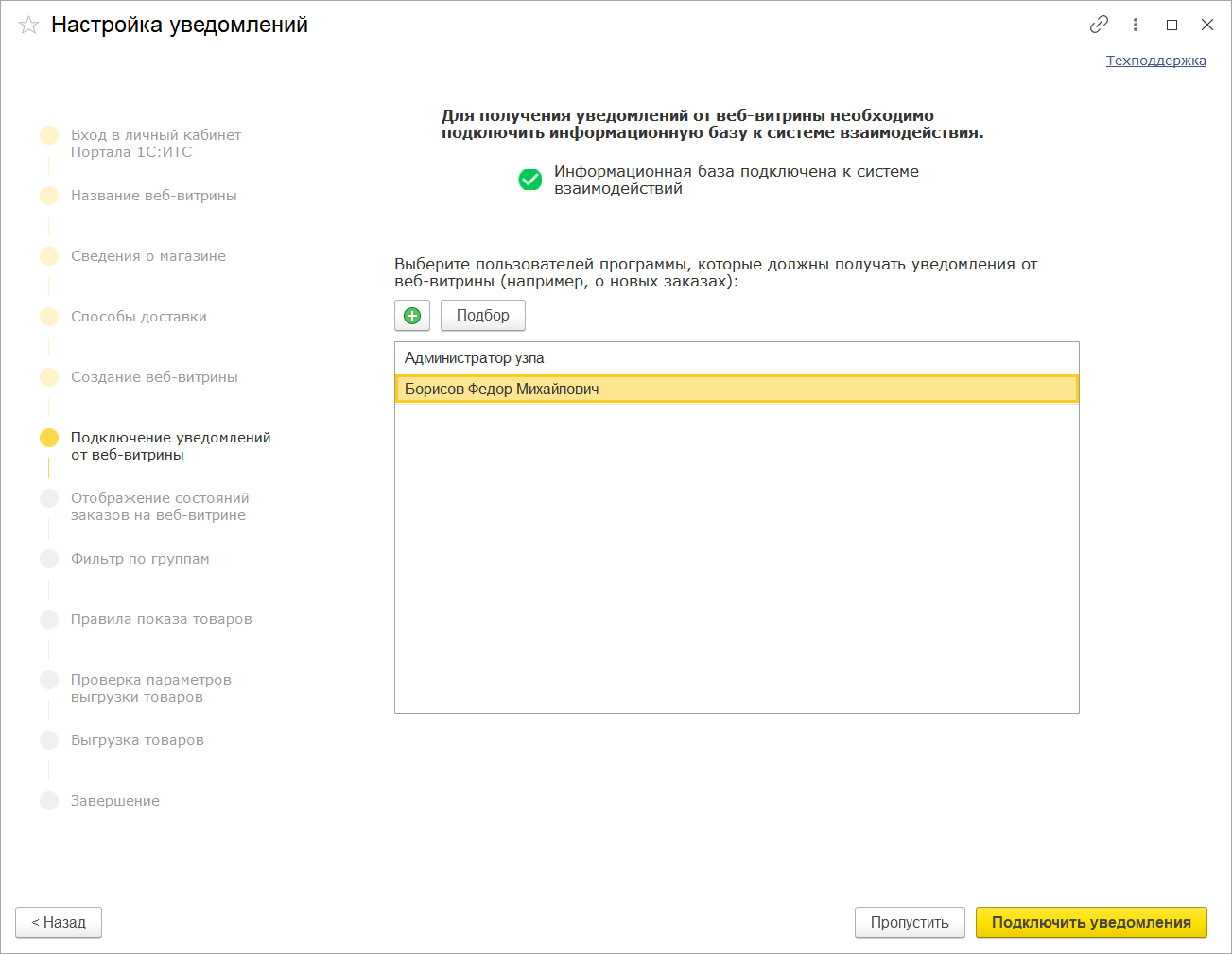 Затем можно определить список пользователей программы, которые будут получать уведомления от витрины.