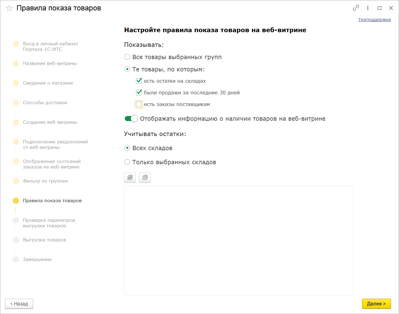 Пользователь на свое усмотрение настраивает правила показа товаров на веб-витрине с учетом наличия товаров, активности продаж и др. показателей.