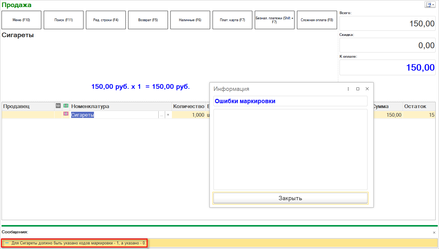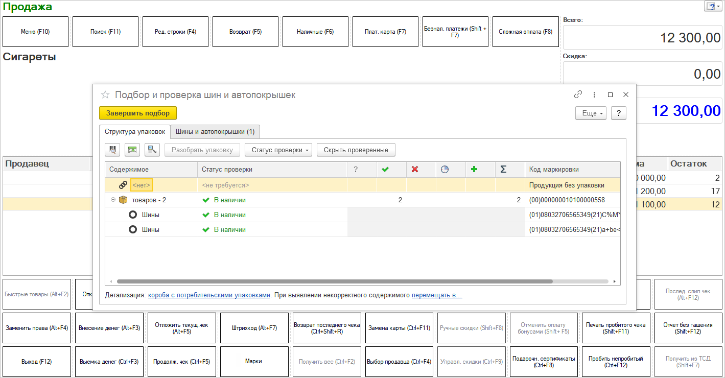 Был реализован новый механизм контроля соответствия марок ИС МП товарам. Старый механизм контроля не учитывал наличие упаковок и не давал пробить, например, 10 пачек сигарет (если упаковки не ведутся), для которых отсканирован 1 блок.