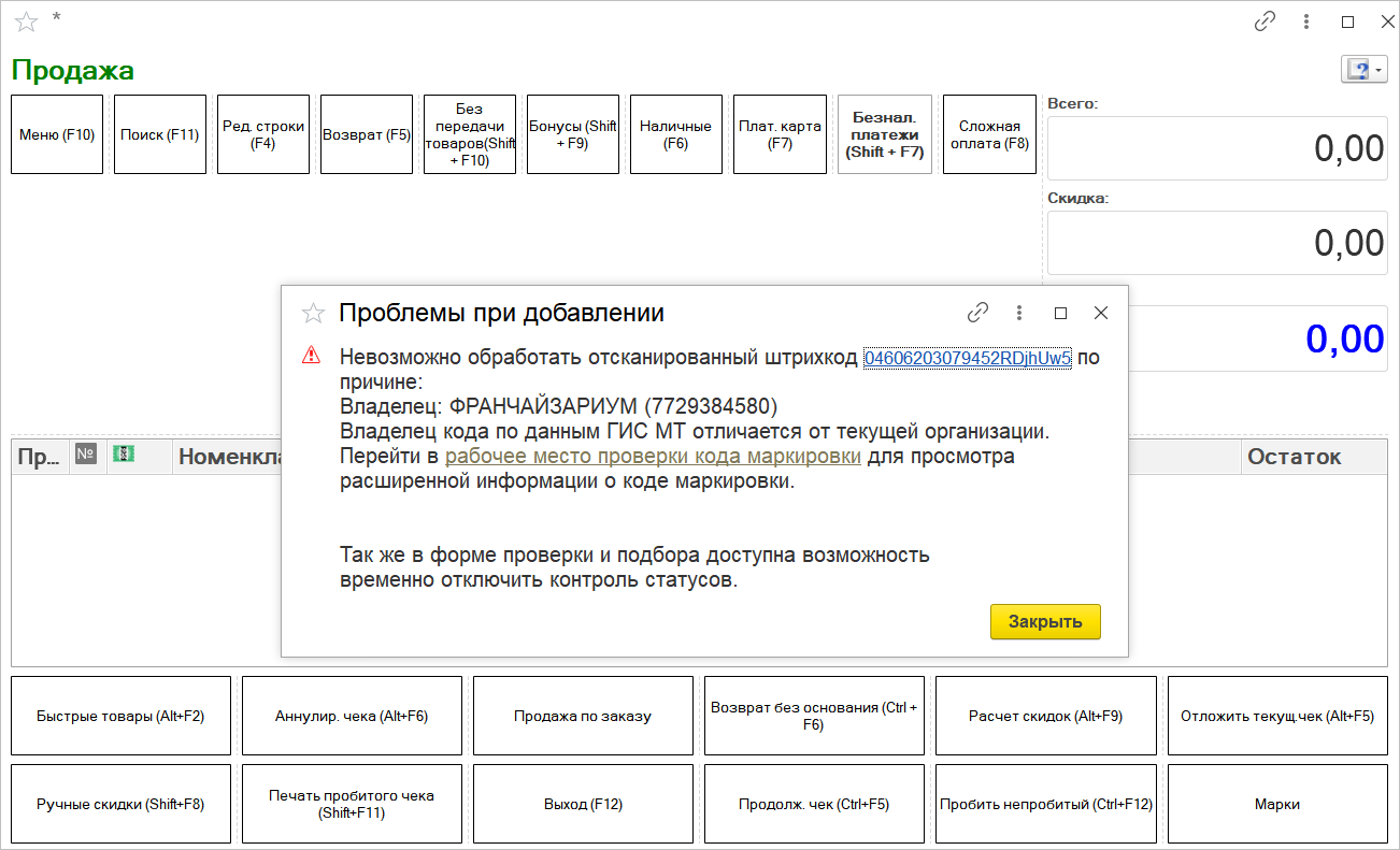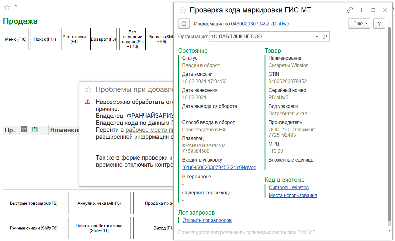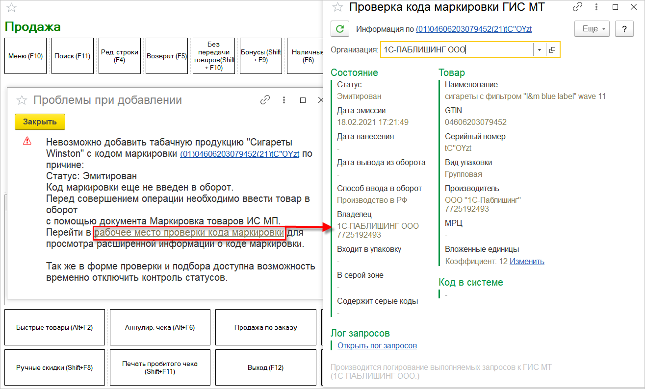 В программу «1С:Розница» встроены проверки кодов маркировки, которые предоставляют пользователю информацию о текущем статусе и владельце кода маркировки. Если при добавлении товаров в документ текущий статус или владелец не соответствуют выполняемой операции, то будет выведено сообщение с описанием проблемы. В окне сообщения доступна ссылка, по которой можно перейти в рабочее место Проверка кодов маркировки.