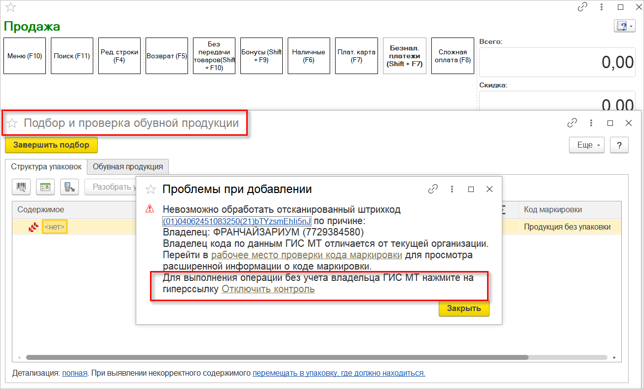 В форме подбора и проверки маркированной продукции отключить проверку по владельцу можно сразу из данного сообщения.