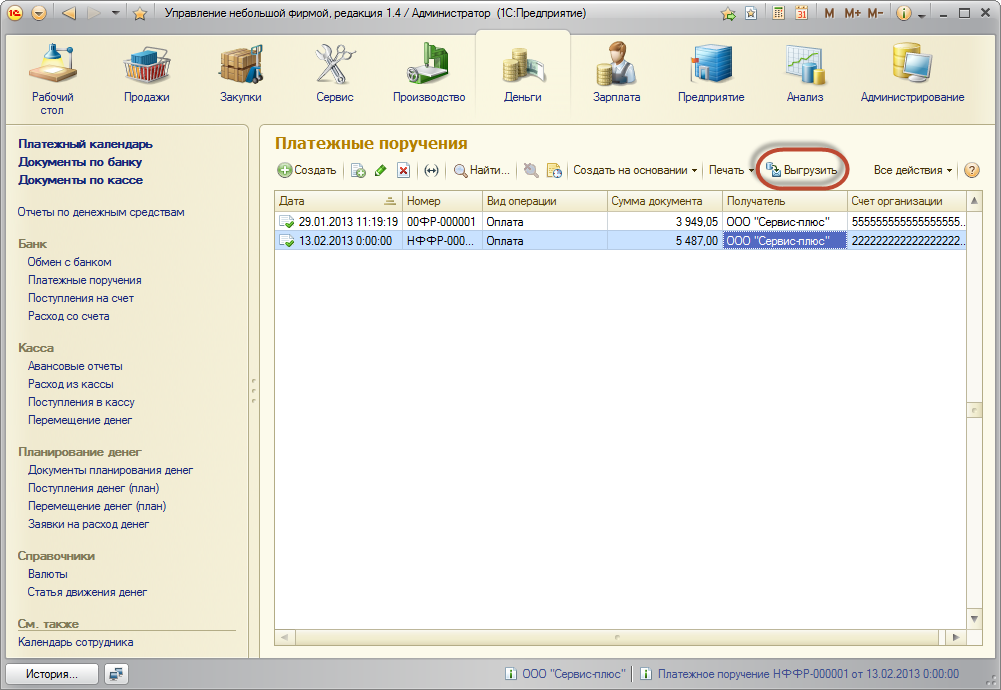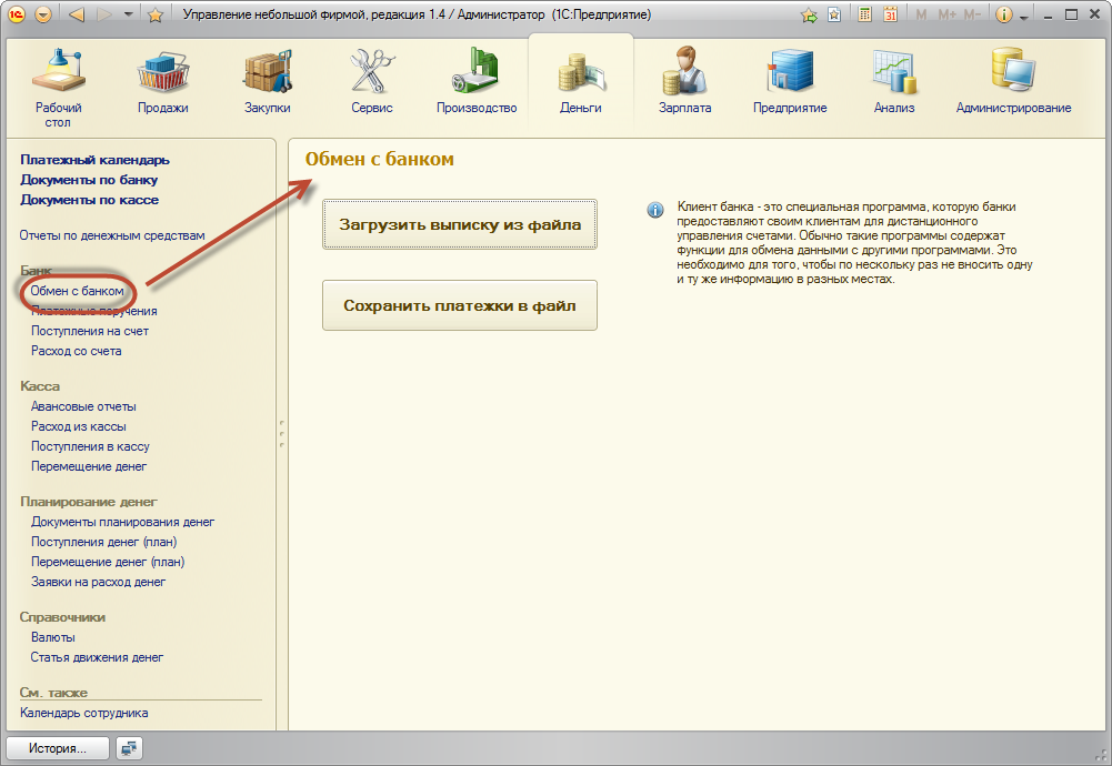 Доступ к механизму осуществляется из раздела Деньги - группа панели навигации Банк - Обмен с банком.