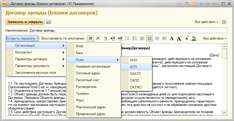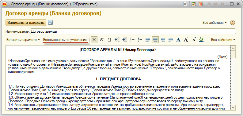 При редактировании текста бланка договора, можно использовать заранее определенные параметры. Эти параметры заполняются из данных конфигурации в момент формирования печатной формы договора. В бланке договора они отображаются как обычный текст, заключенный в фигурные скобки.