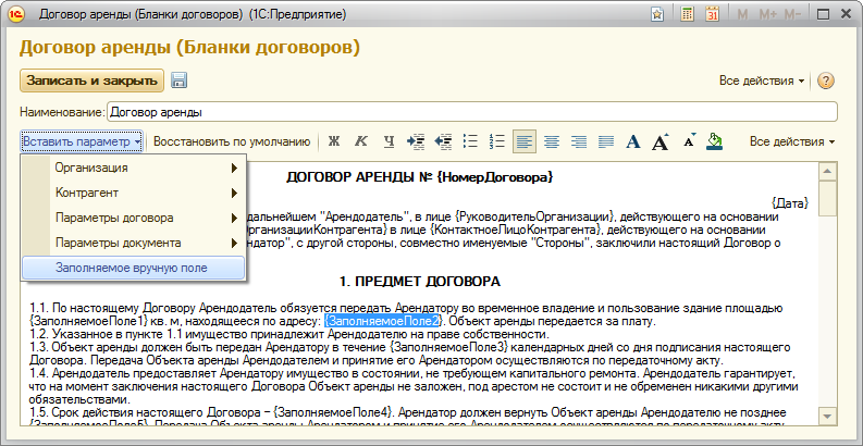 Дополнительно в бланки, можно включать редактируемые параметры (кнопка Заполняемое вручную поле). Эти параметры заполняются вручную уже непосредственно перед печатью договора, в окне с печатной формой договора.