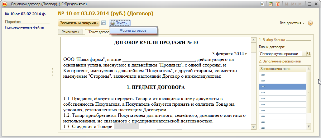 В конфигурацию включены четыре готовых бланка (бланк договора аренды, купли-продажи, оказания услуг, поставки). Эти бланки можно их изменять и копировать.