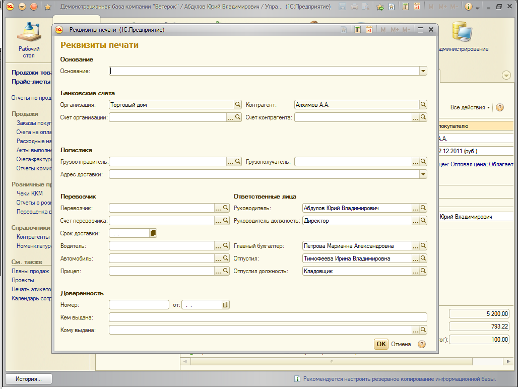 В документах Расходная накладная, Перемещение запасов и Отчет о переработке улучшена работа с печатью документа ТТН и ТОРГ-12. Автоматизировано заполнение транспортного раздела и сведений о доверенности. Произошел отказ от формы, открываемой непосредственно перед печатью ТТН. Добавлено сохранение выбранных сведений для печати в каждом документе. Добавлены справочники транспортных средств, лицензионных карточек.