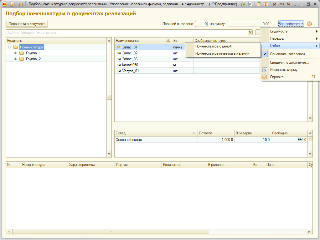 Добавлена новая форма подбора номенклатуры для документов продаж и закупок. К основным возможностям формы относятся: