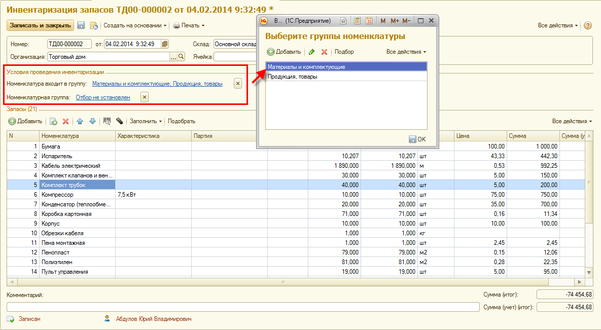 В документ Инвентаризация запасов добавлена возможность заполнения по условиям. Возможно заполнение с отбором по группе, в которую входит номенклатура и по номенклатурной группе, которая указана в карточке номенклатуры на закладке Основные параметры.