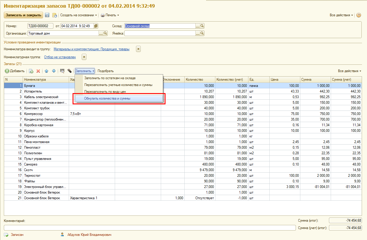 Кроме этого, в документ добавлена возможность обнуления фактического количества и суммы, для повышения удобства заполнения количества при помощи сканера штрихкода.
