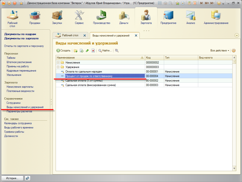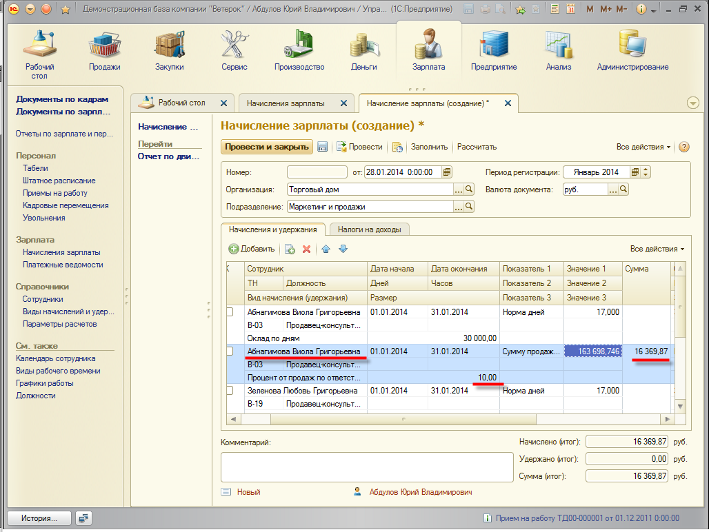 Новый вид начисления: расчет заработной платы в зависимости от суммы продаж по ответственным сотрудникам.