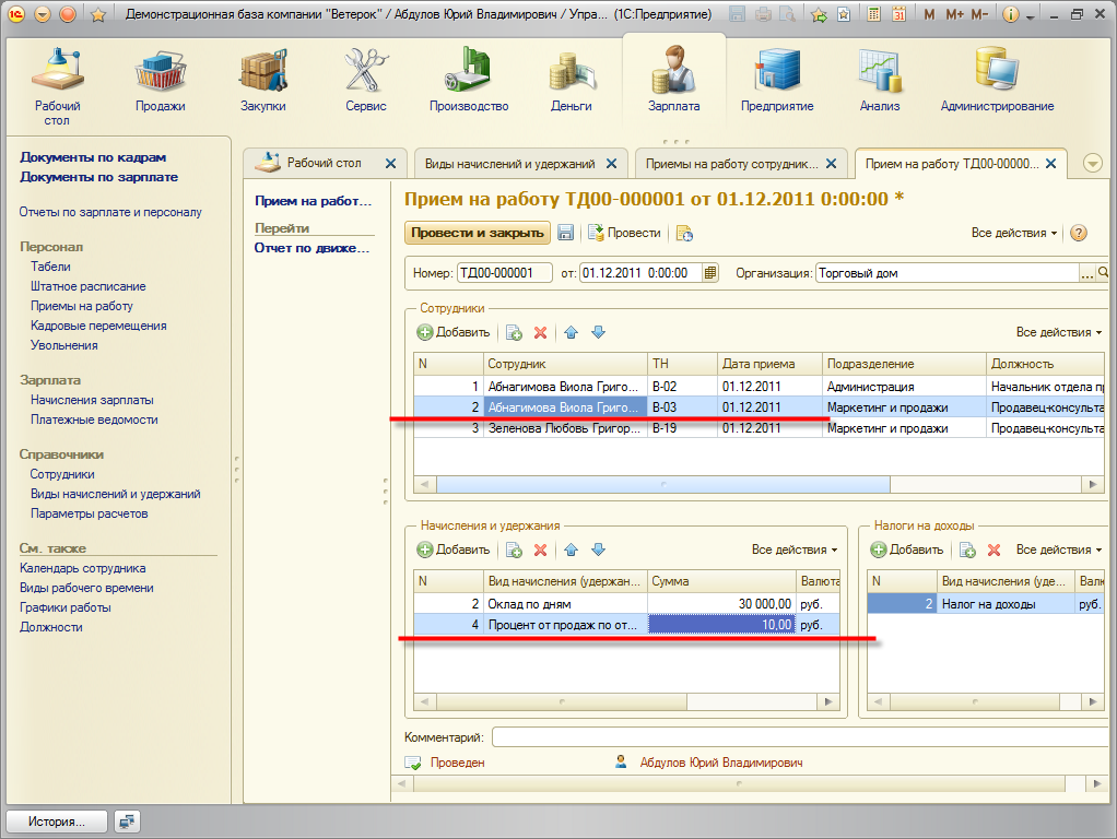 - Вид начисления указывается при приеме на работу в табличной части Начисления. В поле сумму (размер) указывается процент, который будет выделяться из общей суммы продаж (базы начисления).