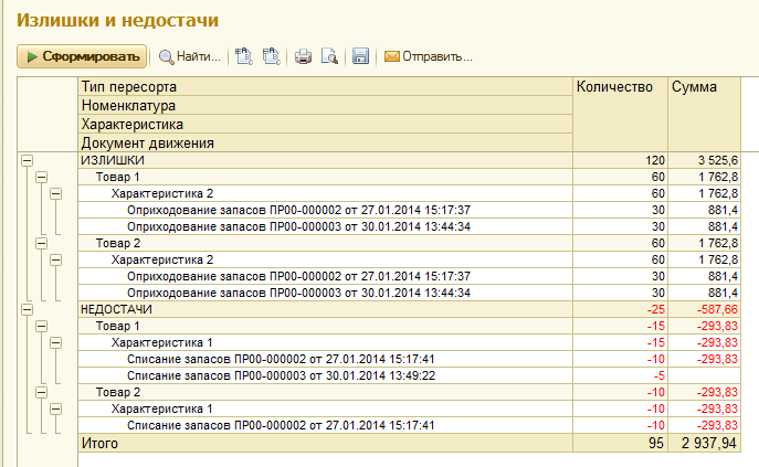 выводится разница между излишками и недостачами. Если разница отрицательная, она выделяется красным цветом.