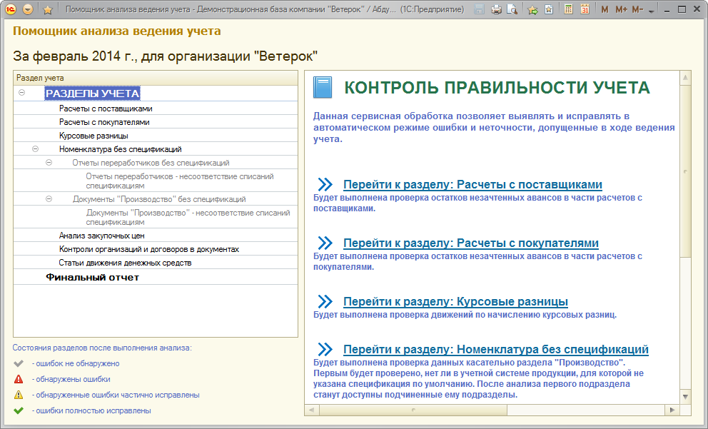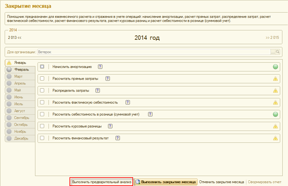 Для операции Закрытие месяца, добавлена сервисная обработка, которая позволяет выявлять и исправлять в автоматическом режиме ошибки и неточности, допущенные в ходе ведения учета. Контроль правильности учета выполняется для разделов учета: расчеты с поставщиками, расчеты с покупателями, курсовые разницы, номенклатура без спецификации, анализа закупочных цен, контроли организаций и договоров в документах и статьи движения денежных средств.