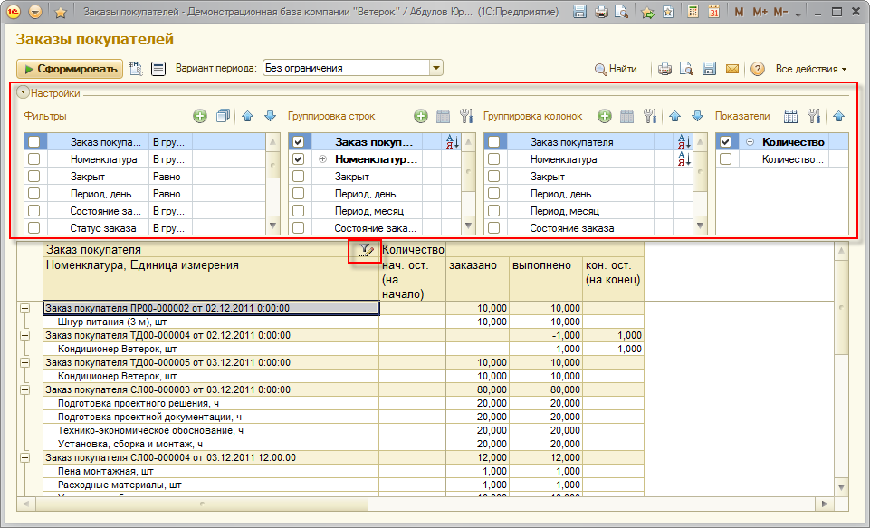 По умолчанию отчет содержит группировки Тип пересорта, Номенклатура, Характеристика (если в настройках