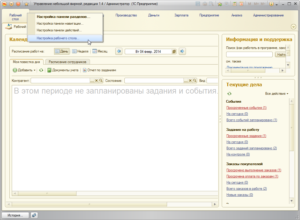 Добавилась возможность размещения календаря сотрудника на рабочем столе. Для этого необходимо, используя правую кнопку мыши, на панели навигации рабочего стола вызвать пункт меню Настройка рабочего стола…