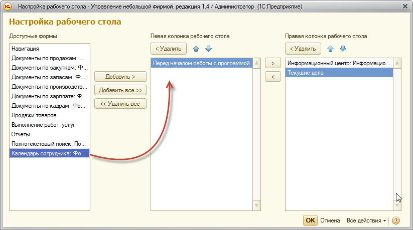 В появившемся окне необходимо перетащить форму Календарь сотрудника в левую или правую колонку рабочего стола.