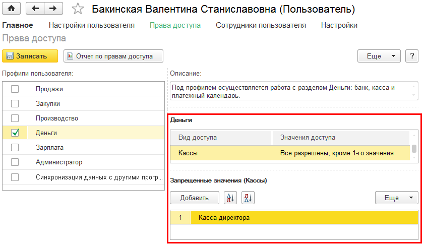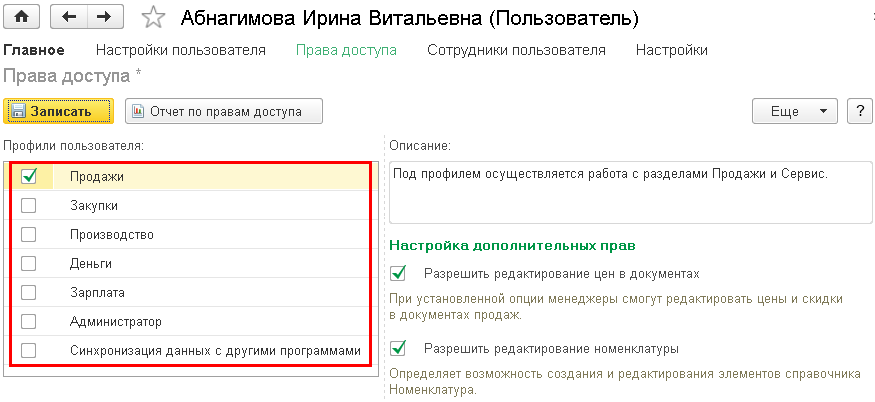 Пользователю могут быть даны права на несколько профилей — например, если пользователь занимается продажами и деньгами, то ему могут быть даны права на разделы Продажи и Деньги.