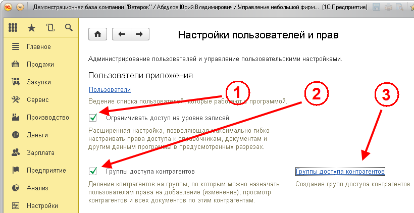 Для включения этой возможности надо войти в раздел программы Настройки, выбрать команду Настройки пользователей и прав и включить режимы Ограничивать доступ на уровне записей и Группы доступа контрагентов. Затем, нажав ссылку Группы доступа контрагентов, надо определить группы доступа.