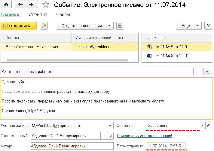 В новой версии программы «1С:Управление небольшой фирмой» отправки электронных писем регистрируются как события. Например, если отправить сформированный документ по электронной почте: