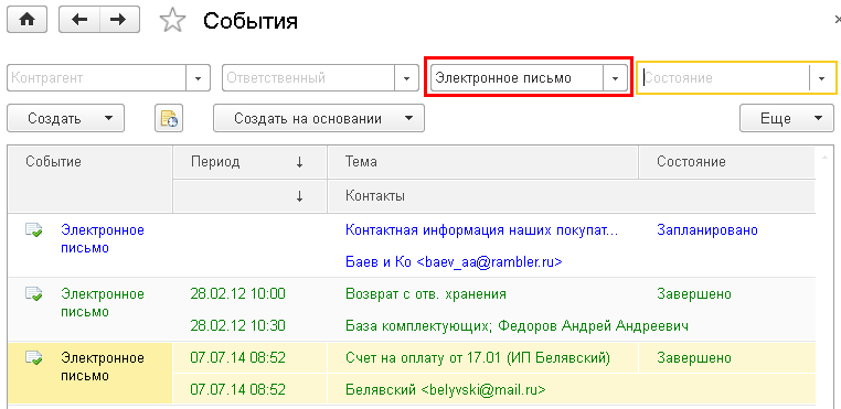 То все реквизиты письма будут сохранены в событии. Поэтому сведения об отправленных электронных письмах можно получить: