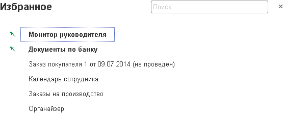 Нажав на строку в панели Избранное, можно быстро перейти к документу, форме или команде, указанным в этой строке. А с помощью поиска — быстро найти нужную строку в этой панели.