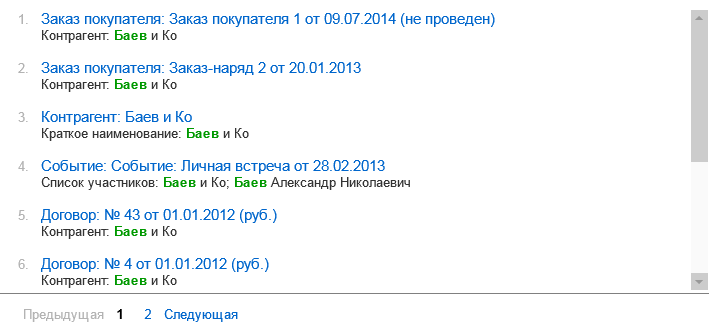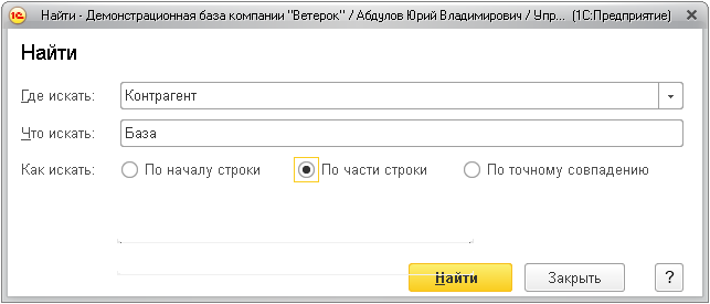 В эту строку нужно ввести искомое слово или фразу, и затем нажать кнопку Найти или клавишу Enter (Ввод). Под строкой поиска будут выведены результаты поиска. Поиск ведется по всем объектам информационной базы программы, к которым пользователь имеет доступ.