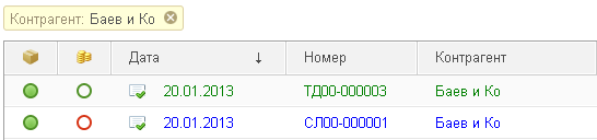 Если на запрос от ФНС получен ответ Прекращена деятельность или изменен КПП, то в формах списка и выбора справочника Контрагенты ИНН и КПП контрагента окрашивается в серый цвет.