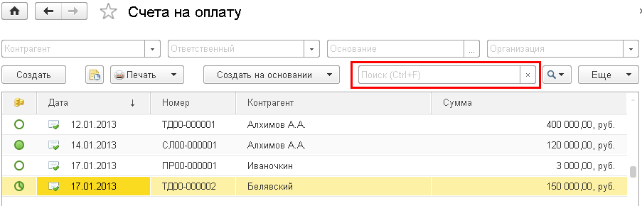 В новой версии программы во всех списках справочников и документов реализованы улучшенные возможности поиска.