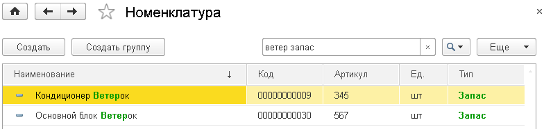 При этом поиск будет производиться по всем колонкам списка, и слова из введенной строки могут быть найдены в разных колонках. Например, на приведенном ниже рисунке для строки поиска ветер запас слово «ветер» было найдено в колонке Наименование, а слово «Запас» в колонке Тип.