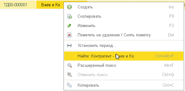 2. Второй способ поиска в списке — это поиск по значению в колонке. Можно выделить любое значение в списке и нажать Alt-Shift-F, или выбрать команду Найти в контекстном меню: