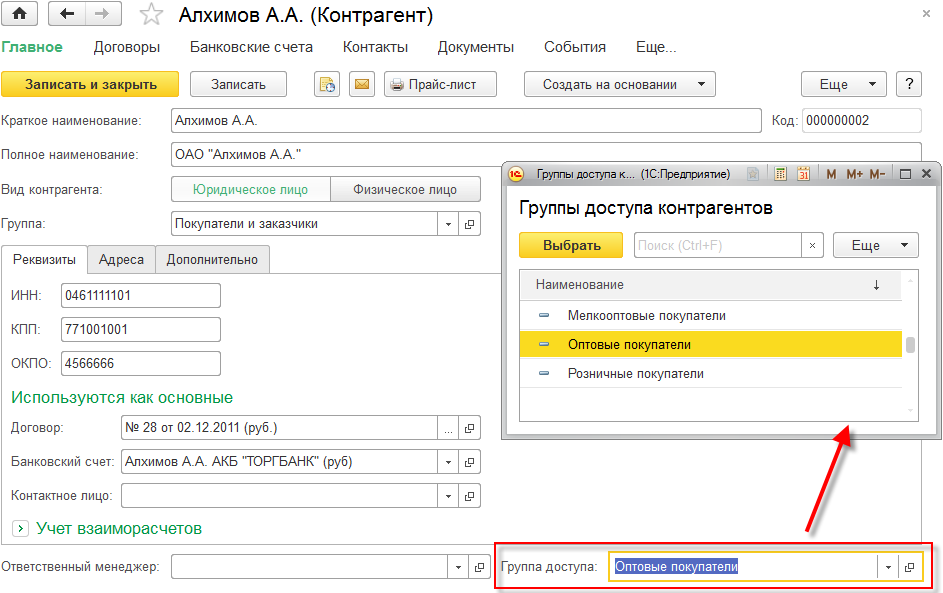 После этого в формах контрагентов появится поле Группа доступа, которое является обязательным для заполнения.