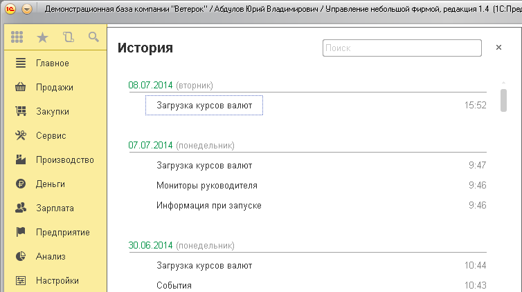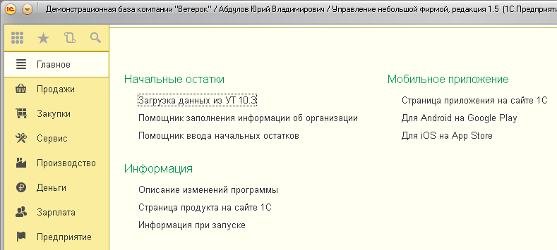 Другим пользователям при первом запуске программы в начальной странице показываются сведения о новой версии программы. А впоследствии для них выводятся сведения по тому разделу программы, за который они отвечают. Например, менеджер по продажам увидит там журнал документов о продажах.