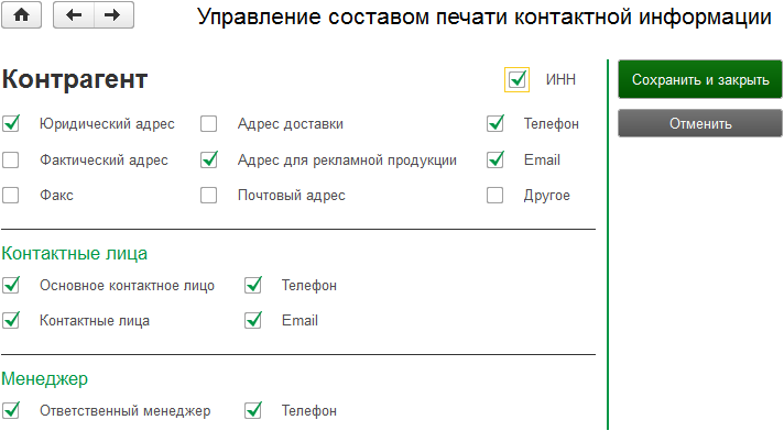 При нажатии кнопки Сохранить и закрыть все сделанные изменения сохраняются. Для каждого пользователя программы настройки печати контактной информации хранятся отдельно.