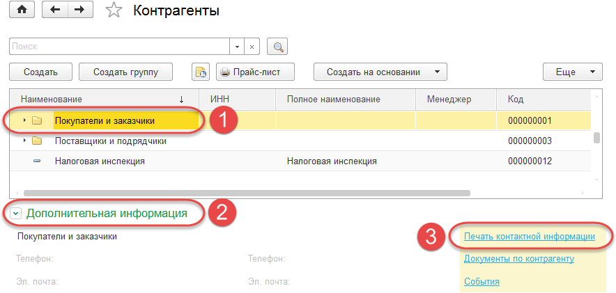 В новой версии программы «1С:Управление небольшой фирмой» необходимые средства появились. Для печати контактной информации в списке контрагентов нужно выполнить следующие действия: