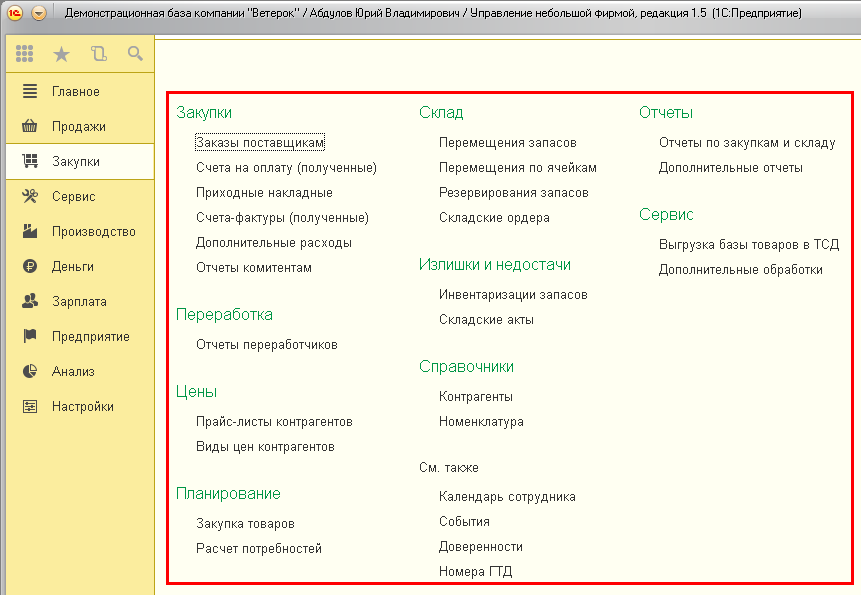 Профили Продажи, Закупки, Производство, Деньги и Зарплата предоставляют пользователю права на соответствующие разделы программы. Например, для менеджера по продажам можно установить профиль Продажи, и тогда ему в программе будет доступен раздел Продажи, а также разделы Главное, Сервис и Настройки: